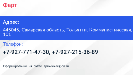 Фарт+ по адресу 445045, Самарская область, Тольятти, Коммунистическая, 101 в дальнейшем Организация, размещена в следующих категориях: