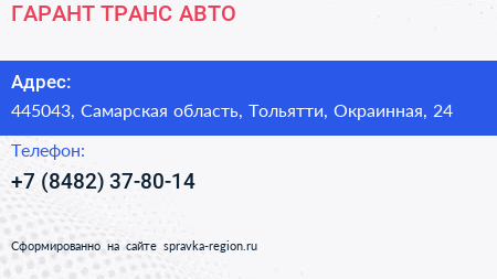 ГАРАНТ-ТРАНС-АВТО по адресу 445043, Самарская область, Тольятти, Окраинная, 24 в дальнейшем Организация, размещена в следующих категориях: