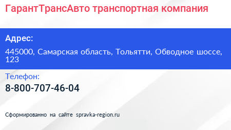 ГарантТрансАвто, транспортная компания по адресу 445000, Самарская область, Тольятти, Обводное шоссе, 123 в дальнейшем Организация, размещена в следующих категориях: