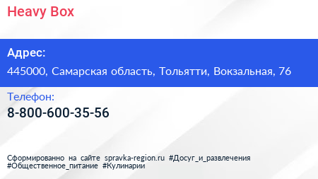 Heavy-Box по адресу 445000, Самарская область, Тольятти, Вокзальная, 76 в дальнейшем Организация, размещена в следующих категориях: