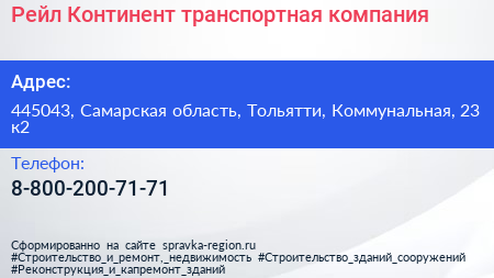Рейл Континент, транспортная компания по адресу 445043, Самарская область, Тольятти, Коммунальная, 23 к2 в дальнейшем Организация, размещена в следующих категориях: