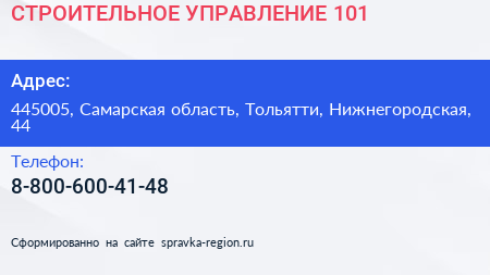 СТРОИТЕЛЬНОЕ УПРАВЛЕНИЕ-101 по адресу 445005, Самарская область, Тольятти, Нижнегородская, 44 в дальнейшем Организация, размещена в следующих категориях: