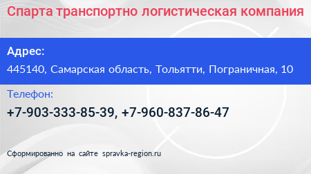 Спарта, транспортно-логистическая компания по адресу 445140, Самарская область, Тольятти, Пограничная, 10 в дальнейшем Организация, размещена в следующих категориях: