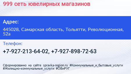 999, сеть ювелирных магазинов по адресу 445028, Самарская область, Тольятти, Революционная, 52а в дальнейшем Организация, размещена в следующих категориях: