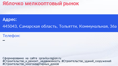 Яблочко, мелкооптовый рынок по адресу 445043, Самарская область, Тольятти, Коммунальная, 36а в дальнейшем Организация, размещена в следующих категориях: