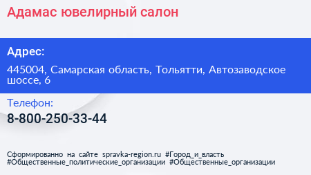 Адамас, ювелирный салон по адресу 445004, Самарская область, Тольятти, Автозаводское шоссе, 6 в дальнейшем Организация, размещена в следующих категориях: