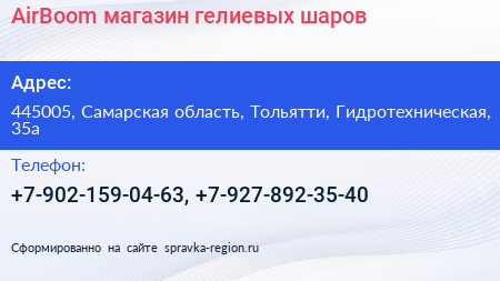 AirBoom, магазин гелиевых шаров по адресу 445005, Самарская область, Тольятти, Гидротехническая, 35а в дальнейшем Организация, размещена в следующих категориях: