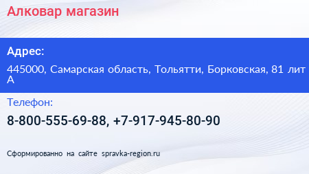 Алковар, магазин по адресу 445000, Самарская область, Тольятти, Борковская, 81 лит А в дальнейшем Организация, размещена в следующих категориях: