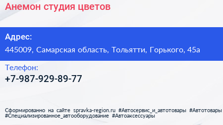 Анемон, студия цветов по адресу 445009, Самарская область, Тольятти, Горького, 45а в дальнейшем Организация, размещена в следующих категориях: