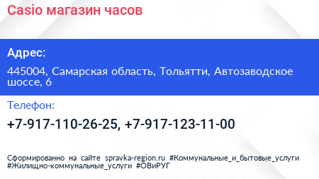 Casio, магазин часов по адресу 445004, Самарская область, Тольятти, Автозаводское шоссе, 6 в дальнейшем Организация, размещена в следующих категориях: