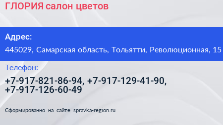 ГЛОРИЯ, салон цветов по адресу 445029, Самарская область, Тольятти, Революционная, 15 в дальнейшем Организация, размещена в следующих категориях: