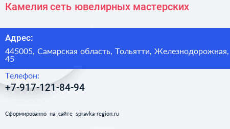 Камелия, сеть ювелирных мастерских по адресу 445005, Самарская область, Тольятти, Железнодорожная, 45 в дальнейшем Организация, размещена в следующих категориях: