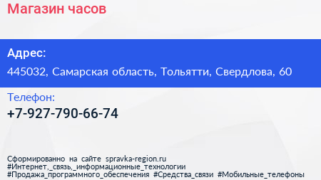 Магазин часов по адресу 445032, Самарская область, Тольятти, Свердлова, 60 в дальнейшем Организация, размещена в следующих категориях:
