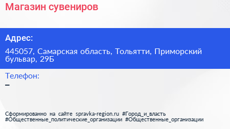 Магазин сувениров по адресу 445057, Самарская область, Тольятти, Приморский бульвар, 29Б в дальнейшем Организация, размещена в следующих категориях: