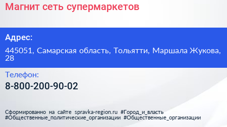 Магнит, сеть супермаркетов по адресу 445051, Самарская область, Тольятти, Маршала Жукова, 28 в дальнейшем Организация, размещена в следующих категориях: