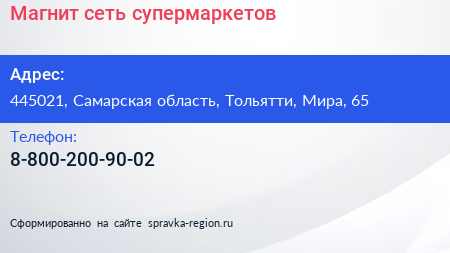 Магнит, сеть супермаркетов по адресу 445021, Самарская область, Тольятти, Мира, 65 в дальнейшем Организация, размещена в следующих категориях: