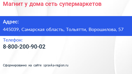 Магнит у дома, сеть супермаркетов по адресу 445039, Самарская область, Тольятти, Ворошилова, 57 в дальнейшем Организация, размещена в следующих категориях: