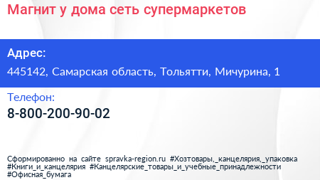 Магнит у дома, сеть супермаркетов по адресу 445142, Самарская область, Тольятти, Мичурина, 1 в дальнейшем Организация, размещена в следующих категориях: