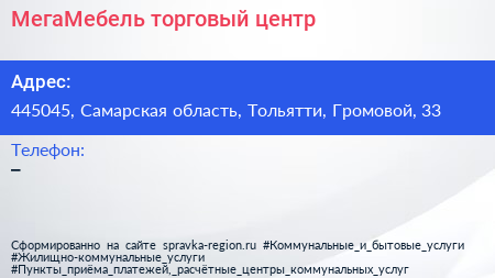 МегаМебель, торговый центр по адресу 445045, Самарская область, Тольятти, Громовой, 33 в дальнейшем Организация, размещена в следующих категориях: