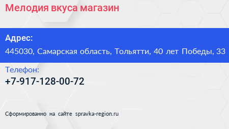 Мелодия вкуса, магазин по адресу 445030, Самарская область, Тольятти, 40 лет Победы, 33 в дальнейшем Организация, размещена в следующих категориях: