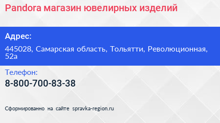 Pandora, магазин ювелирных изделий по адресу 445028, Самарская область, Тольятти, Революционная, 52а в дальнейшем Организация, размещена в следующих категориях: