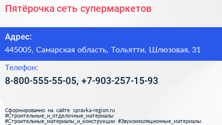 Пятёрочка, сеть супермаркетов по адресу 445005, Самарская область, Тольятти, Шлюзовая, 31 в дальнейшем Организация, размещена в следующих категориях: