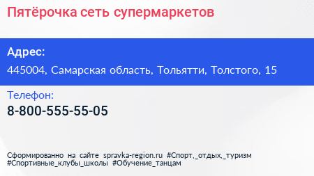 Пятёрочка, сеть супермаркетов по адресу 445004, Самарская область, Тольятти, Толстого, 15 в дальнейшем Организация, размещена в следующих категориях: