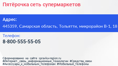 Пятёрочка, сеть супермаркетов по адресу 445359, Самарская область, Тольятти, микрорайон В-1, 18 в дальнейшем Организация, размещена в следующих категориях: