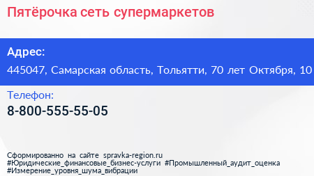 Пятёрочка, сеть супермаркетов по адресу 445047, Самарская область, Тольятти, 70 лет Октября, 10 в дальнейшем Организация, размещена в следующих категориях: