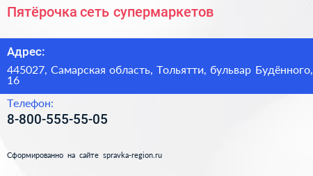 Пятёрочка, сеть супермаркетов по адресу 445027, Самарская область, Тольятти, бульвар Будённого, 16 в дальнейшем Организация, размещена в следующих категориях: