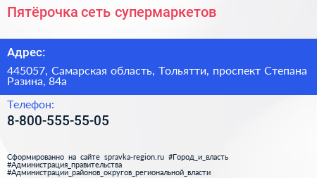 Пятёрочка, сеть супермаркетов по адресу 445057, Самарская область, Тольятти, проспект Степана Разина, 84а в дальнейшем Организация, размещена в следующих категориях: