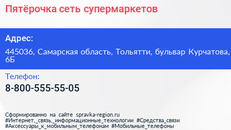 Пятёрочка, сеть супермаркетов по адресу 445036, Самарская область, Тольятти, бульвар Курчатова, 6Б в дальнейшем Организация, размещена в следующих категориях: