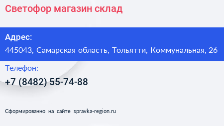 Светофор, магазин-склад по адресу 445043, Самарская область, Тольятти, Коммунальная, 26 в дальнейшем Организация, размещена в следующих категориях: