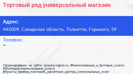 Торговый ряд, универсальный магазин по адресу 445009, Самарская область, Тольятти, Горького, 59 в дальнейшем Организация, размещена в следующих категориях: