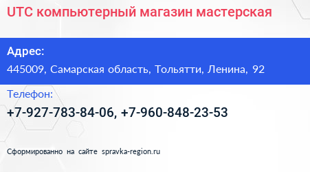 UTC, компьютерный магазин-мастерская по адресу 445009, Самарская область, Тольятти, Ленина, 92 в дальнейшем Организация, размещена в следующих категориях: