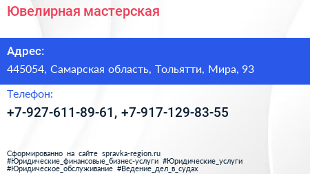 Ювелирная мастерская по адресу 445054, Самарская область, Тольятти, Мира, 93 в дальнейшем Организация, размещена в следующих категориях: