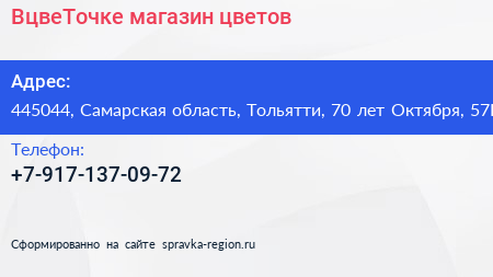 ВцвеТочке, магазин цветов по адресу 445044, Самарская область, Тольятти, 70 лет Октября, 57Б в дальнейшем Организация, размещена в следующих категориях: