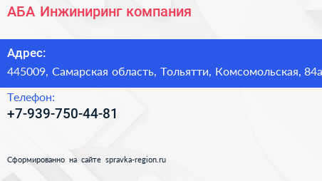 АБА Инжиниринг, компания по адресу 445009, Самарская область, Тольятти, Комсомольская, 84а в дальнейшем Организация, размещена в следующих категориях: