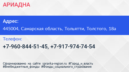 АРИАДНА по адресу 445004, Самарская область, Тольятти, Толстого, 18а в дальнейшем Организация, размещена в следующих категориях: