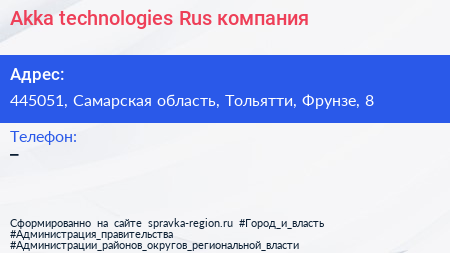 Akka technologies Rus, компания по адресу 445051, Самарская область, Тольятти, Фрунзе, 8 в дальнейшем Организация, размещена в следующих категориях: