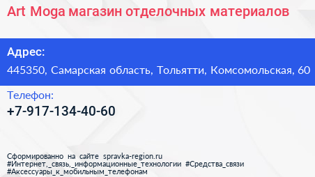 Art Moga, магазин отделочных материалов по адресу 445350, Самарская область, Тольятти, Комсомольская, 60 в дальнейшем Организация, размещена в следующих категориях: