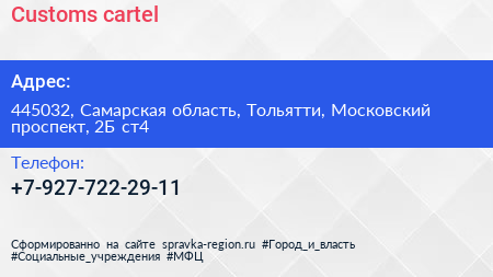 Customs cartel по адресу 445032, Самарская область, Тольятти, Московский проспект, 2Б ст4 в дальнейшем Организация, размещена в следующих категориях: