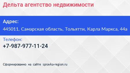 Дельта, агентство недвижимости по адресу 445011, Самарская область, Тольятти, Карла Маркса, 44а в дальнейшем Организация, размещена в следующих категориях: