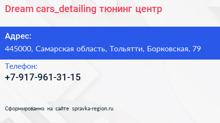 Dream cars_detailing, тюнинг-центр по адресу 445000, Самарская область, Тольятти, Борковская, 79 в дальнейшем Организация, размещена в следующих категориях: