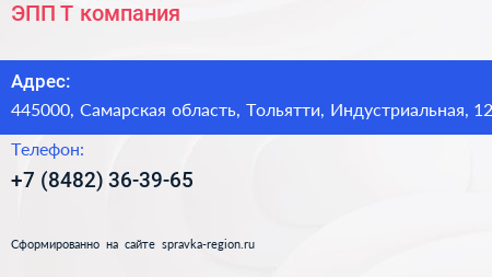 ЭПП-Т, компания по адресу 445000, Самарская область, Тольятти, Индустриальная, 12 в дальнейшем Организация, размещена в следующих категориях: