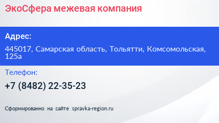 ЭкоСфера, межевая компания по адресу 445017, Самарская область, Тольятти, Комсомольская, 125а в дальнейшем Организация, размещена в следующих категориях: