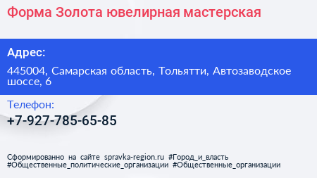 Форма Золота, ювелирная мастерская по адресу 445004, Самарская область, Тольятти, Автозаводское шоссе, 6 в дальнейшем Организация, размещена в следующих категориях: