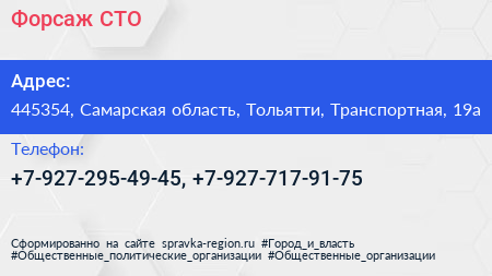 Форсаж, СТО по адресу 445354, Самарская область, Тольятти, Транспортная, 19а в дальнейшем Организация, размещена в следующих категориях: