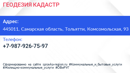 ГЕОДЕЗИЯ & КАДАСТР по адресу 445011, Самарская область, Тольятти, Комсомольская, 93 в дальнейшем Организация, размещена в следующих категориях: