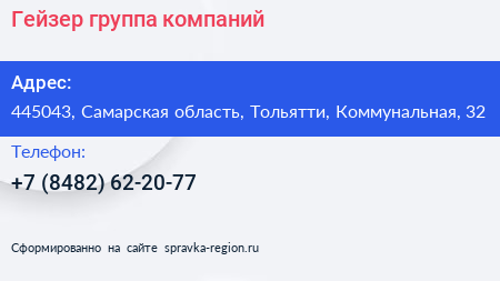 Гейзер, группа компаний по адресу 445043, Самарская область, Тольятти, Коммунальная, 32 в дальнейшем Организация, размещена в следующих категориях: